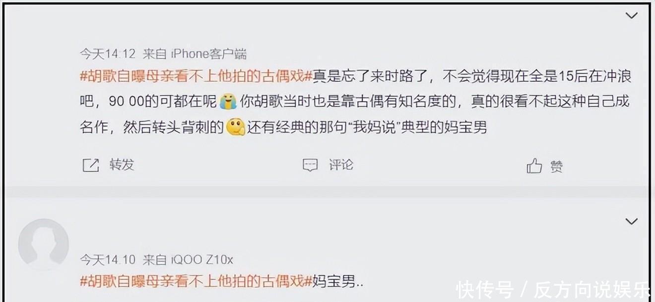 果不其然,胡歌和他妈妈都被吐槽了,有网友觉得胡岁了还把妈妈挂嘴边,好一个妈宝男;有网友觉得胡歌就是靠古偶火的,却因为妈妈的话否定来时路,不愧是妈宝男。