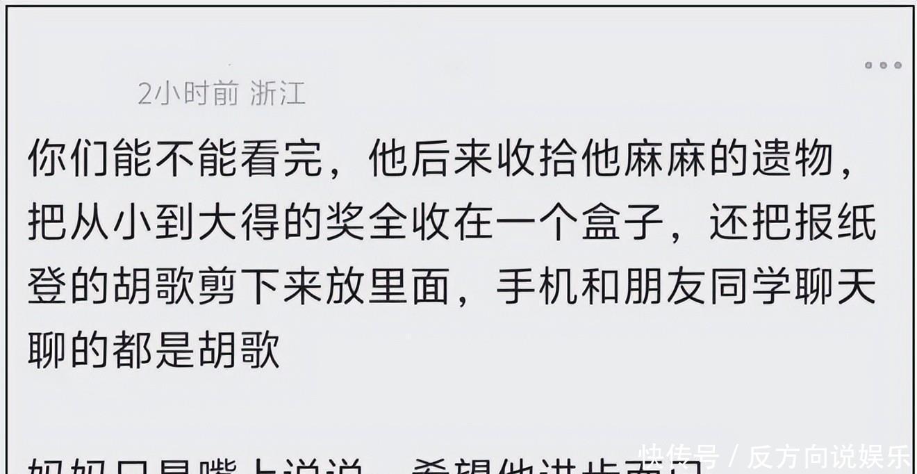 还有网友指出,不管胡歌本意如何,他在采访中把自己的事业选择和妈妈联系到一起,很容易让已经去世了的妈妈挨骂,而网友的担心不无道理。